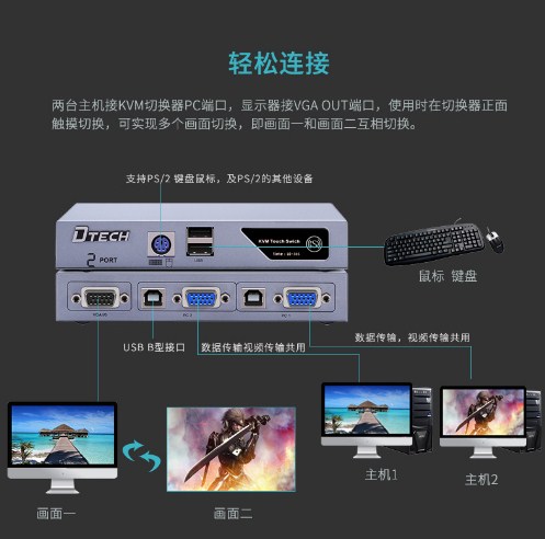 Bộ KVM Switch 2 Port VGA USB and PS2 chính hãng DTECH DT-8021 VGA USB KVM Switch Hub cung cấp điều khiển đơn giản hai máy tính từ một màn hình duy nhất / hiển thị và thiết lập USB ngoại vi (bàn phím, chuột). Việc chuyển đổi USB KVM có hub USB 2 cổng tích hợp và 1 cổng PS/2, cho phép bạn chia sẻ kết nối thiết bị ngoại vi USB giữa hai kiểm soát các máy tính PC / Mac như là mặc dù các thiết bị được kết nối trực tiếp. Chọn vị trí và lắp đặt thuận tiện, KVM switch có thể lắp rack-mountable 1U yếu tố hình thức và cổng kết nối phía sau để làm chủ và máy tính chạm, cho phép bạn thực hiện các kết nối thiết bị cần thiết mà không phá vỡ không gian làm việc của bạn. Một giải pháp nền tảng, KVM switch hỗ trợ các ứng dụng độ phân giải cao lên đến 1920x1440 và cung cấp một kinh nghiệm hoạt động trơn tru khi kiểm soát môi trường hỗn hợp (Windows / Mac OS / Linux). Sản phẩm trên đã bao ngồm 2 cáp KVM 1.8M đi kèm theo bộ KVM