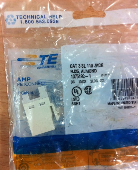 AMP CAT3 MODULAR JACK, UNSHIELDED (1375192-1) AMP Category 3 Modular Jack, Unshielded, RJ11/14/25C, SL, Almond (part number :1375192-1) |