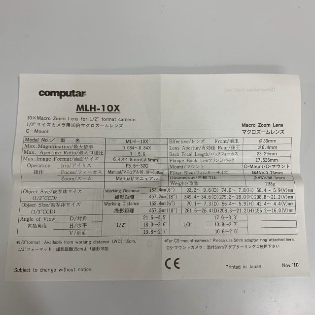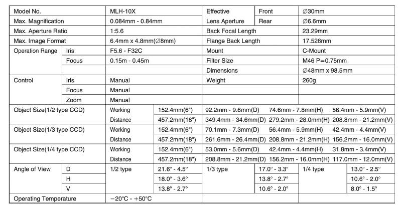 Loại sản phẩm: Computar MLH-10X Macro Zoom Lens 1/2" 13-130mm 10X