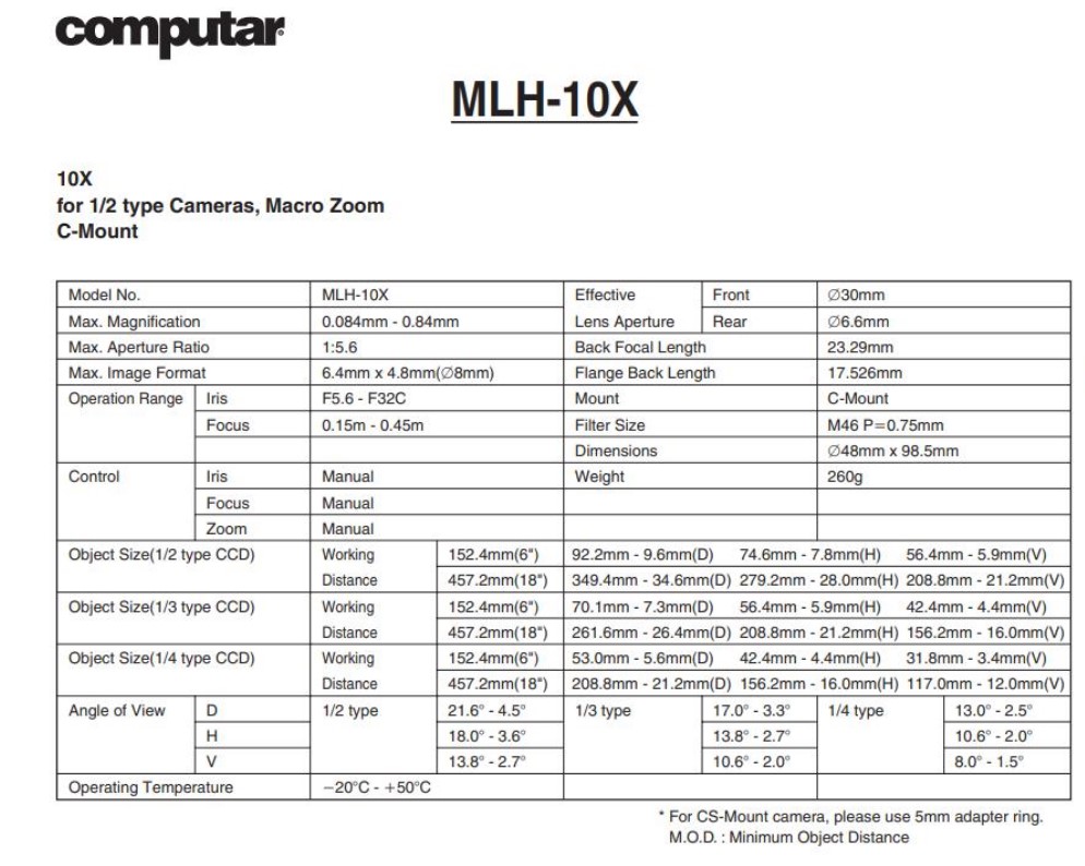 Computar MLH-10X industrial camera zoom C-mount lens