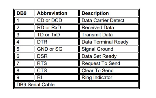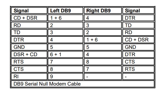 one cross-over or null modem connection following the pinout in the table below. Remember, each