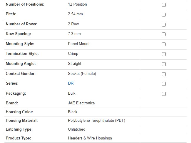 Rắc Connector JAE Electronics JAE DR-12-2S 12 Pin Pitch 2.54mm Headers & Wire Housings 12POS HOUSING 2.54MM PLUG