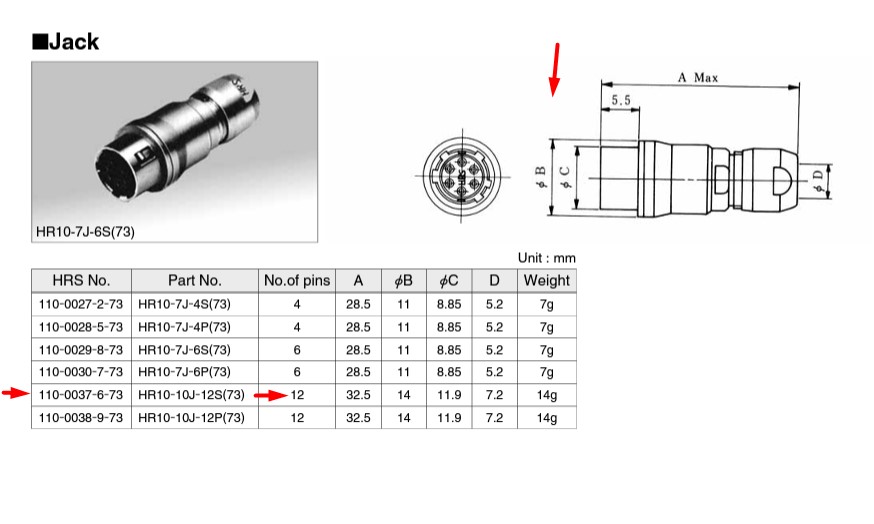 Datasheet Hirose Jack HR10-10J-12S(73) 12 Pin Femela