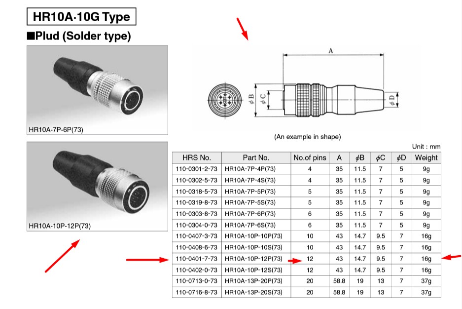 Datasheet Hirose Jack HR10A-10P-12P(73) 12 Pin Male