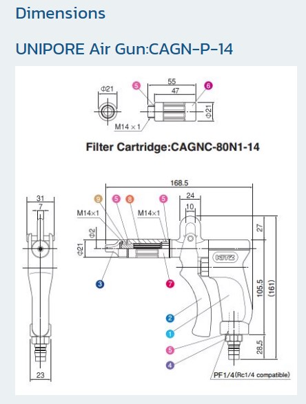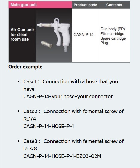 Súng xịt khí CAGN-14 là súng khí phòng sạch với thân nhựa ABS, được thiết kế với lọc khí gồm các sợ rỗng ở đầu súng. Lọc giữ lại được các hạt bụi kích thước 0.01 Micromet và có thể thay thế được.